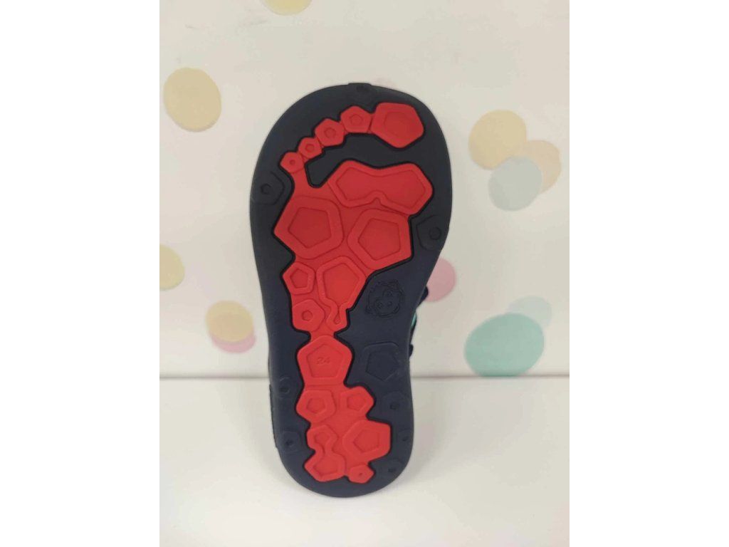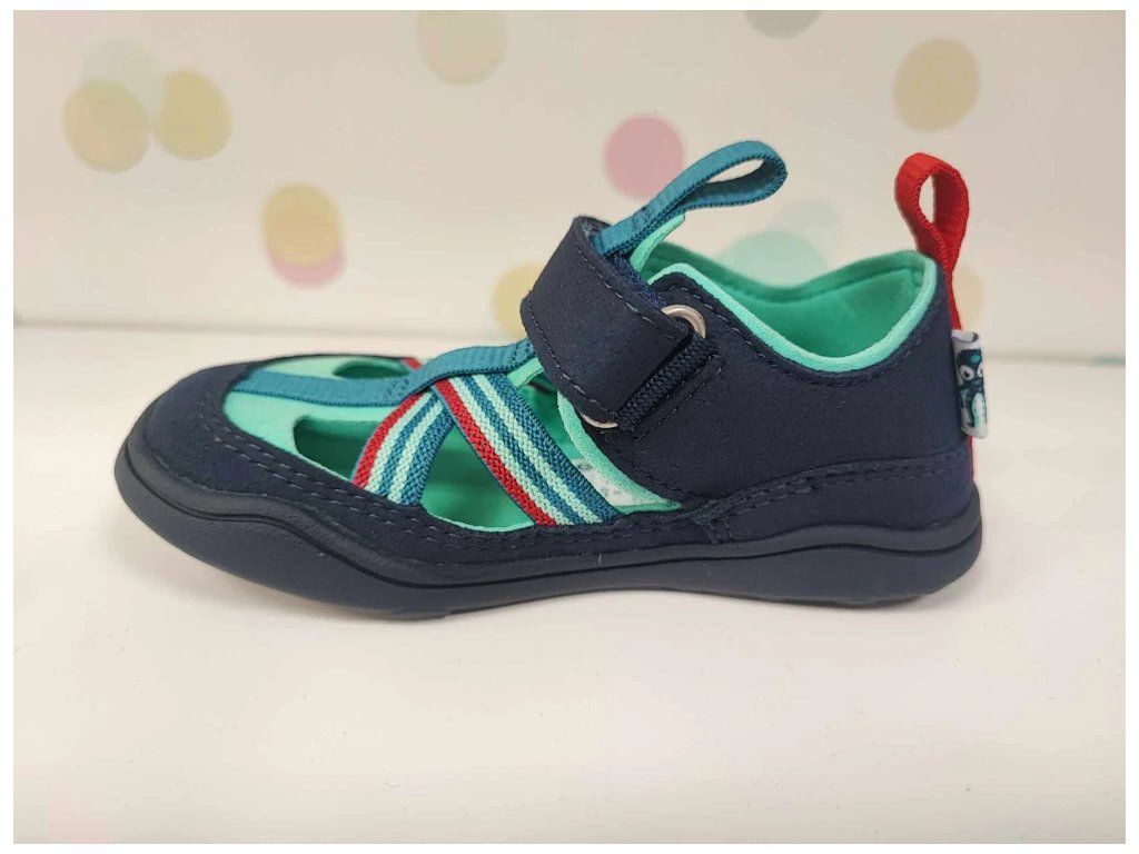Sandály nemají opatek, takže podporují přirozený vývoj dětské nohy. Flexibilní podrážka se ohýbá všemi směry a má nulový rozdíl mezi výškou špičky a paty (nulový drop). Vnitřní stélka je rovná, bez tvarovaného profilu.