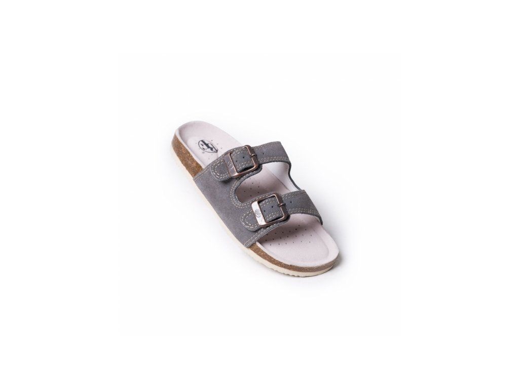 Kožené pantofle v šedé barvě s anatomicky tvarovanou prodyšnou stélkou s klenbou.