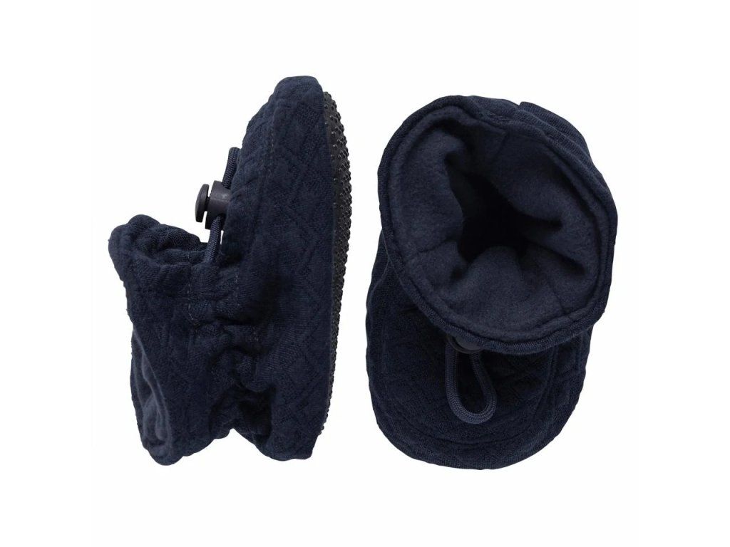 Textilní pantofle s polyesterovou podšívkou a semišovou podrážkou, s praktickou stahovací šňůrkou, která drží botu na noze.