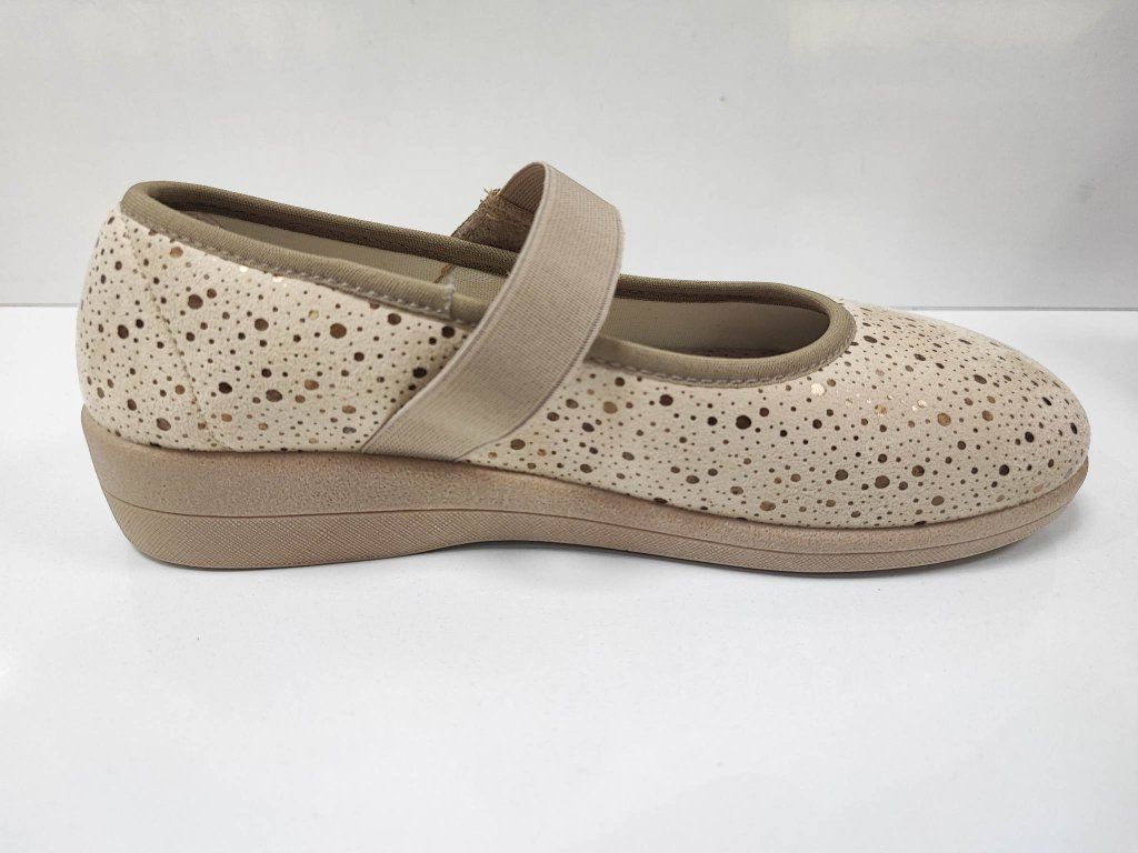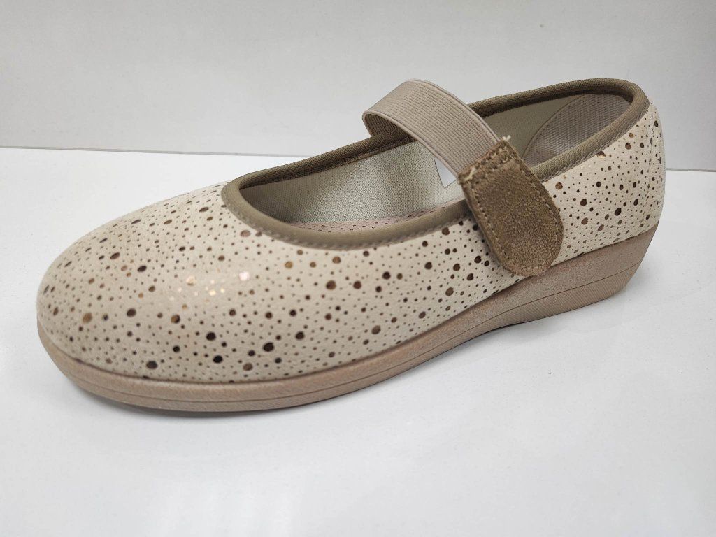 Béžové dámské otevřené pantofle na styl balerínek s měkkou stélkou přispějí k domácímu pohodlí. Tyto pantofle využijete jako domácí obuv. Přes nárt vede pásek s gumičkou na suchý zip, který zajistí, že botičky dobře drží na nožce. Papučky mají vyjímatelnou stélku, takže si místo ní můžete dát svoji vlastní stélku.