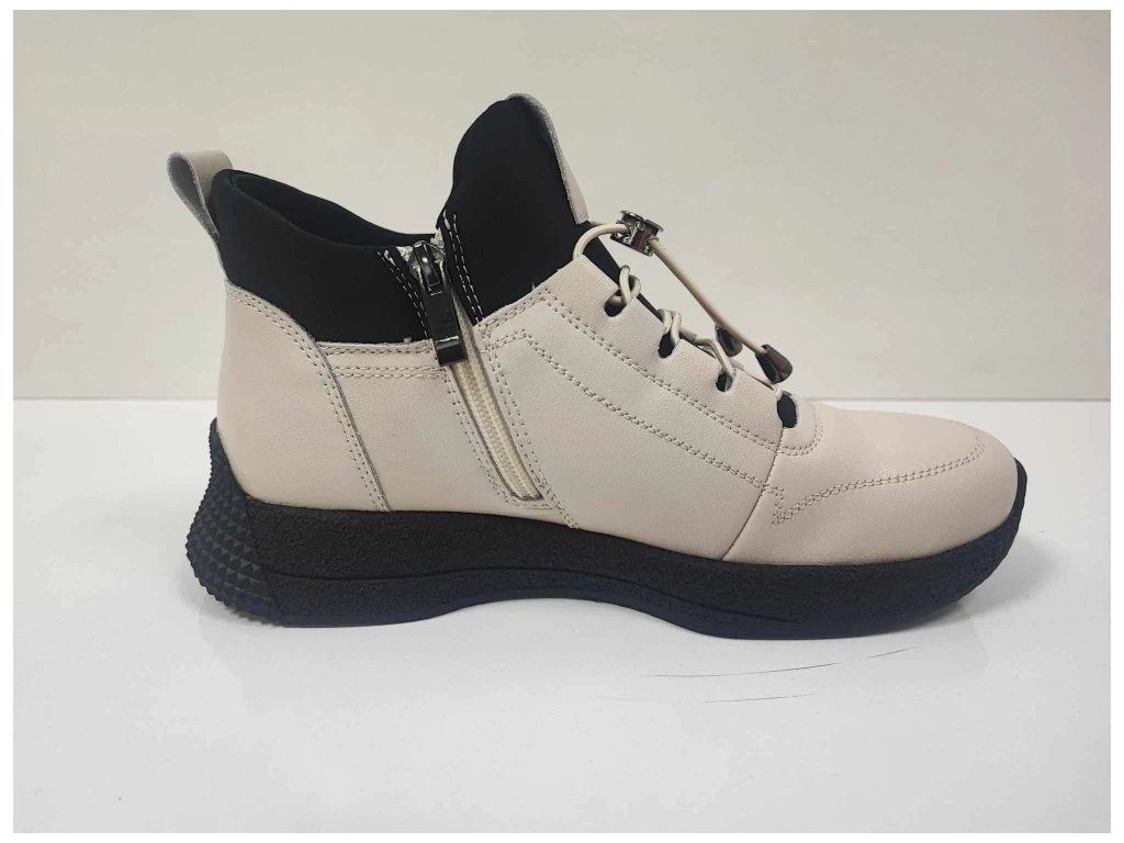 Stylová dámská kotníková obuv. Podšívka je podšita hřejivým textilem, ideální kombinace pro podzimní dny. Možnost jednoduchého obutí pomocí dlouhého zipu na vnitřní straně a dotažení pomocí tkaniček. Stélka je tvarovaná a vyjímatelná – můžete si místo ní dát tedy svoji stélku.