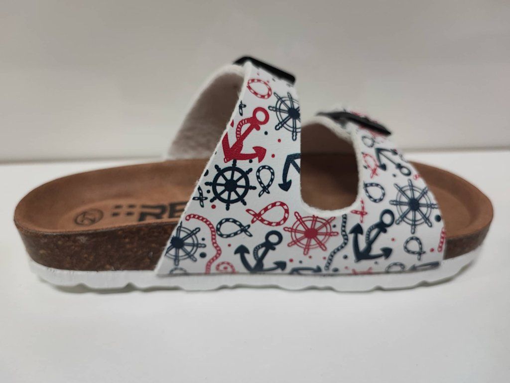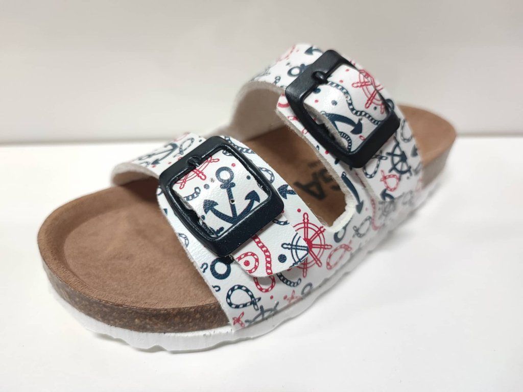 Zdravotní korkové pantofle s bílou podešví pro každodenní užití doma, ve škole a školce. Klasický „dvoupáskový“ model bot s regulovatelným obvodem svršku a s podporou u malíkové hrany. Jednoduchý světlý design s lákavými námořnickými motivy. Vyrobeno ve Španělsku.