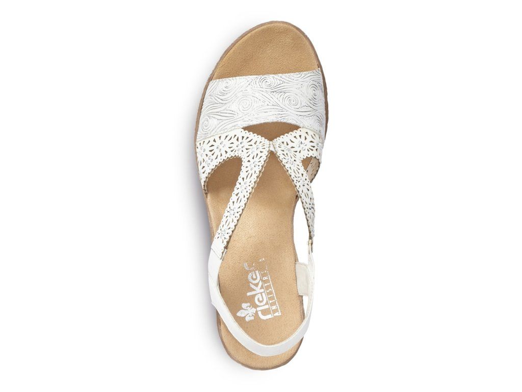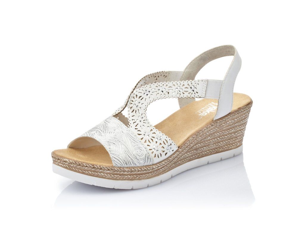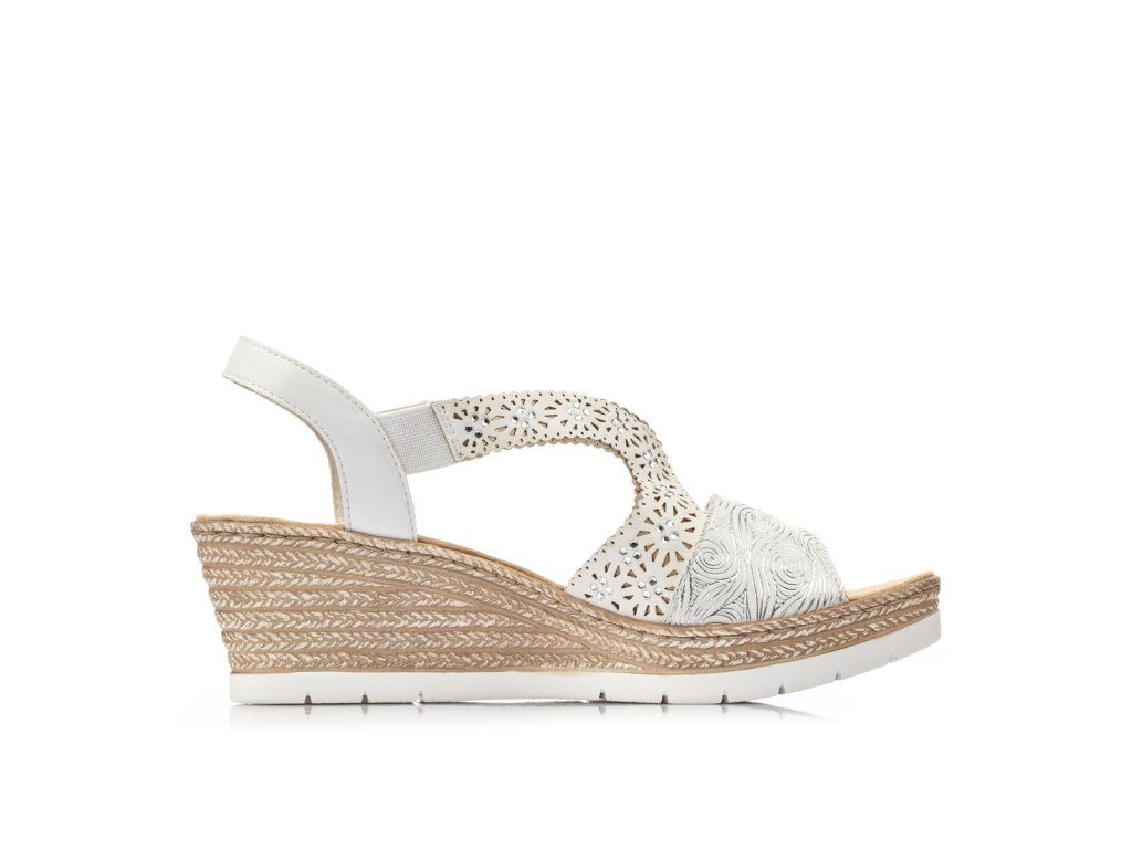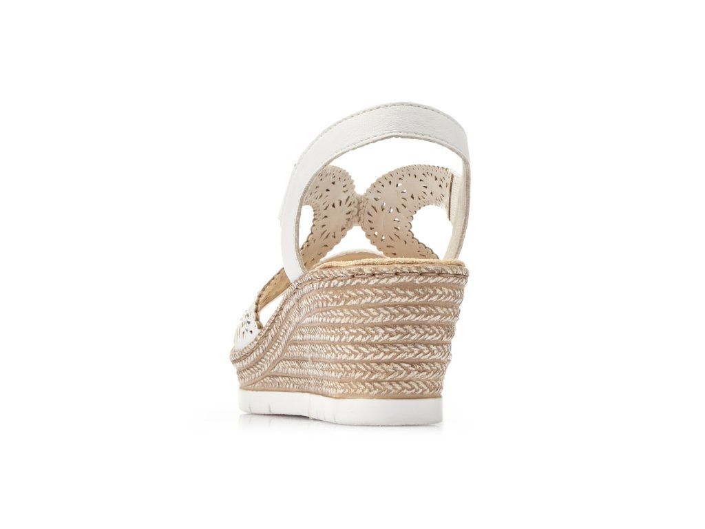 Dámské sandály na platformě ve dvou barevných provedeních mají po stranách nártu dva perforované pásky zdobené kamínky, přední pásek je pak ozdoben vkusným vzorem. Dalším zdobným prvkem je barevné spojení bílé a béžové barvy použité na podešvi, která je lehká a flexibilní. Pro snadné nazouvání slouží pružné gumičky na spojení zadního pásku kolem paty a bočních perforovaných. Obuv bude dobře vypadat jak se sukní, tak i k letním kalhotám.