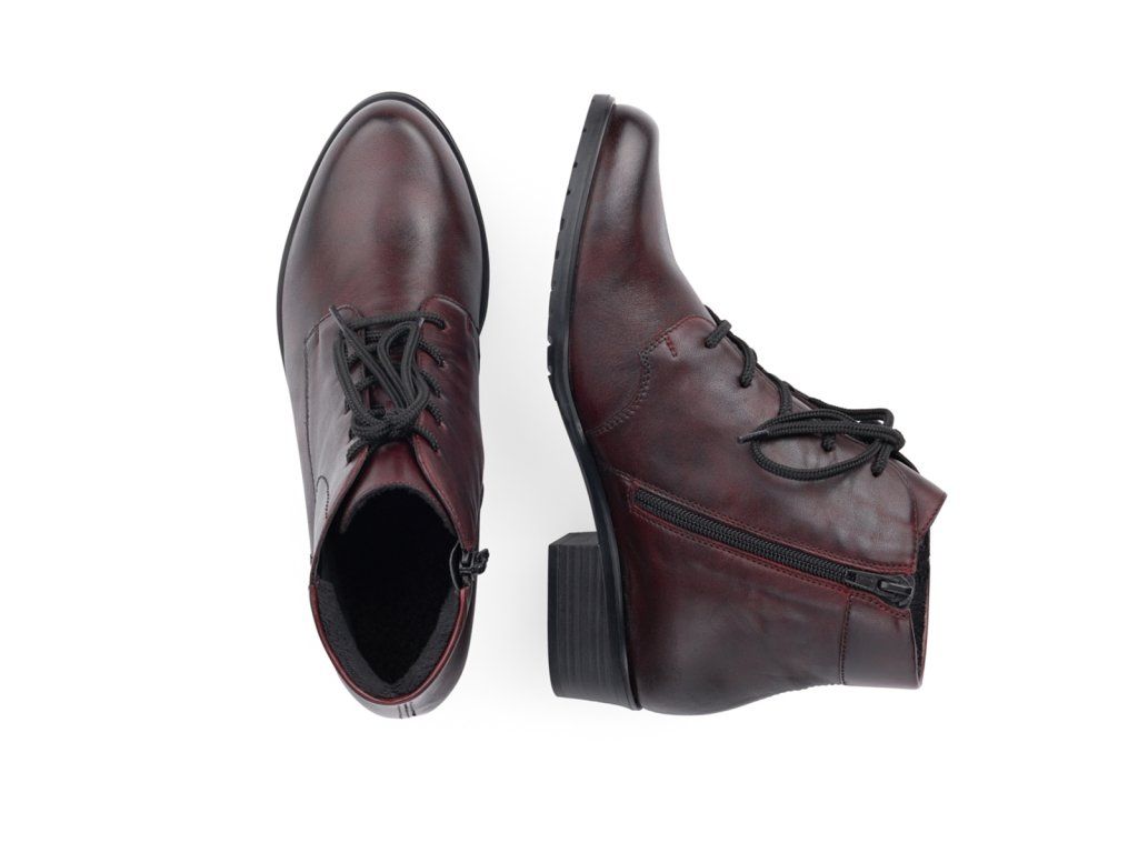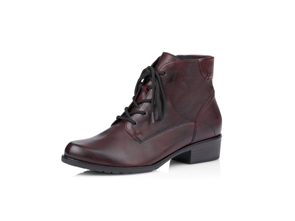 Nádherný dámský kotník šitý z pravé kůže červené barvy doplní každý Váš outfit. Lehké zdobení v podobě elegantního šití černou nití a nízký podpatek podtrhují ladnost této boty. Šněrováním si obuv upravíte dle svých požadavků a funkční zipe pomůže při prozutí. Vyjímatelnou stélku můžete kdykoliv vyměnit či vyvětrat. Velurovou podšívku oceníte při chladných zimních dnech. Boty z řady Remonte Vám zajistí maximální komfort při celodenním nošení.