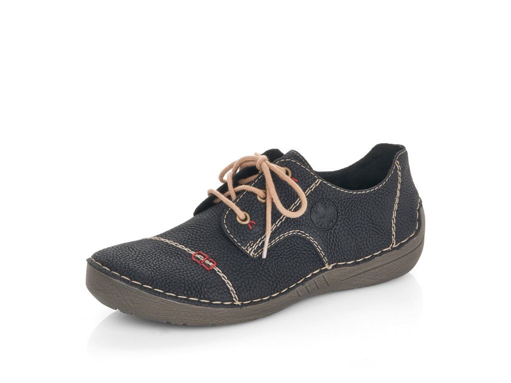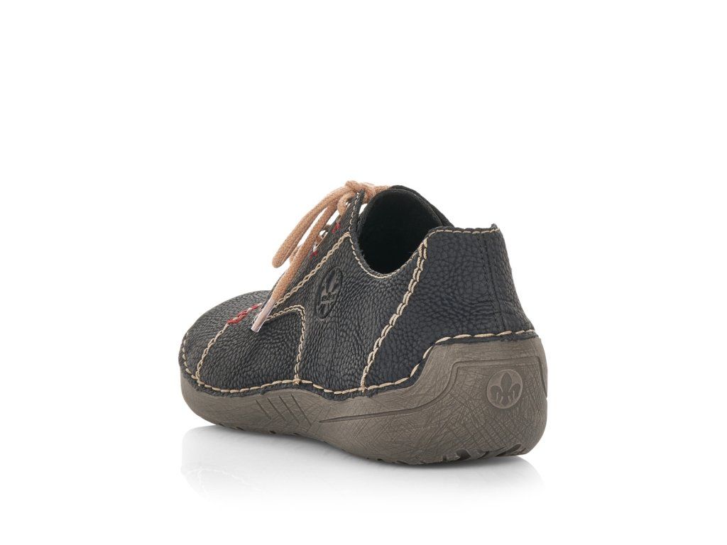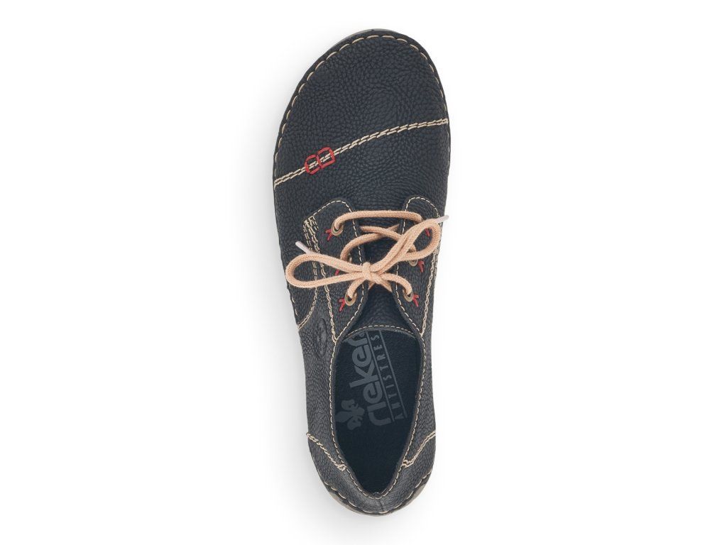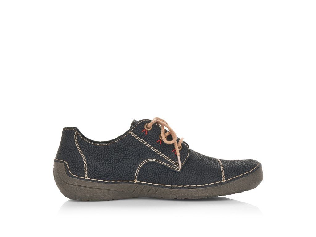 Dámská černá obuv RIEKER s béžovým výrazným prošíváním je doplněna malým logem značky na vnější straně boty. Tkaničky na šněrování slouží pro lepší přizpůsobení přímo na Vaši nohu. Stélka je vyrobena z unikátní paměťové pěny, která se maximálně přizpůsobí tvaru Vašeho chodidla. Podešev je vyrobena technologií Antistress, díky níž je lehká, flexibilní, absorbuje nárazy při došlapu a snadno se přizpůsobí každé noze. Tento ležérní model skombinujete snad s každým outfitem.