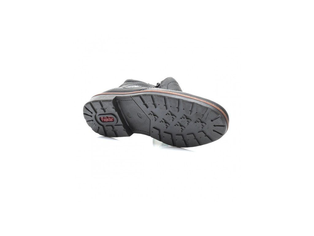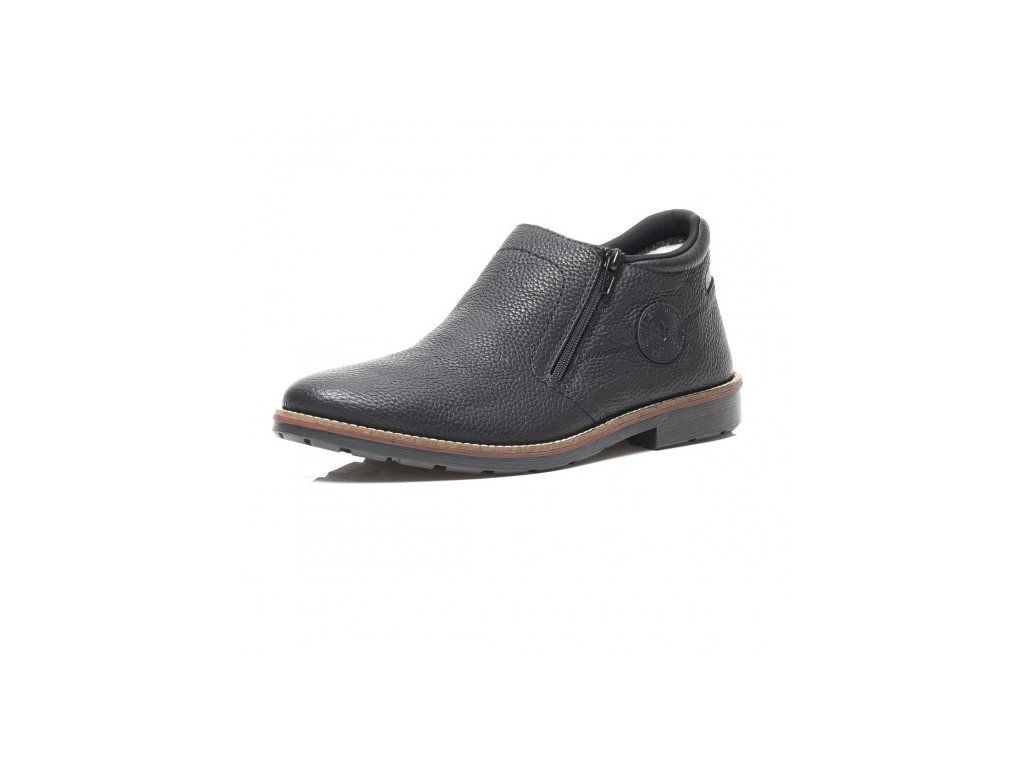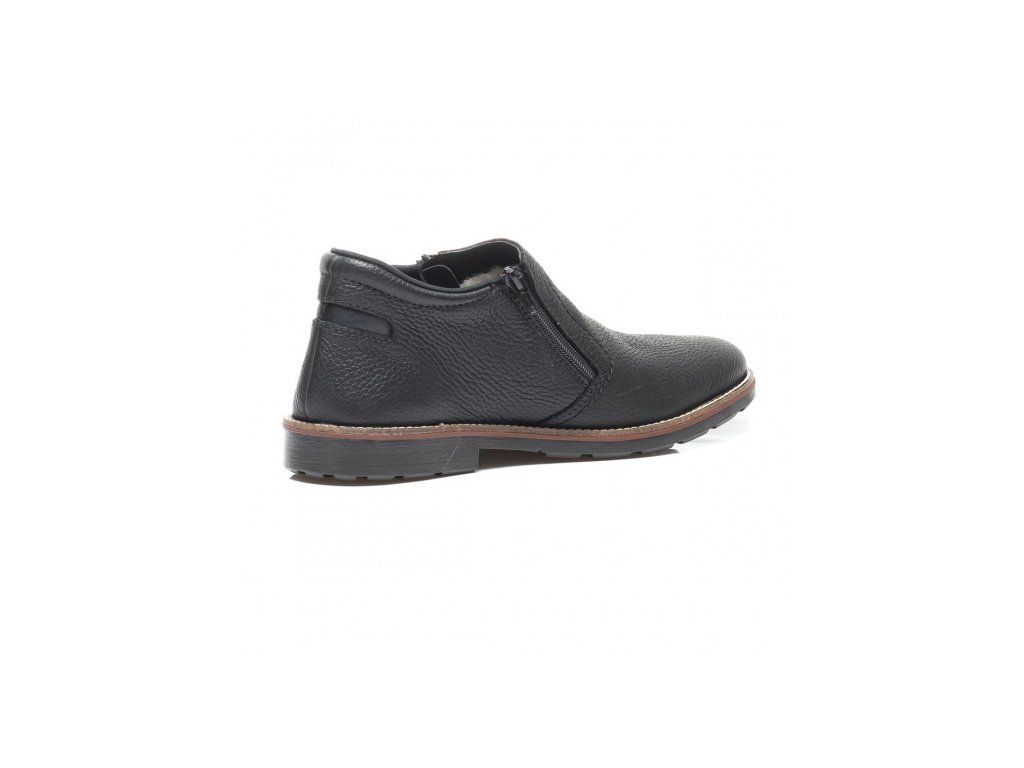 Pánská polobotka je ušita z pravé kůže v černé barvě a zdobená je znakem Rieker na vnější straně a kontrastním lemováním i šitím podešve. Má kulatou špičku, po stranách dva funkční zipy pro snadné obutí a podšívku z pravé ovčí vlny. Tento model je velmi pohodlný a praktický.