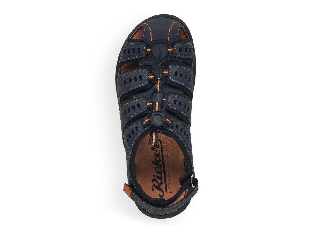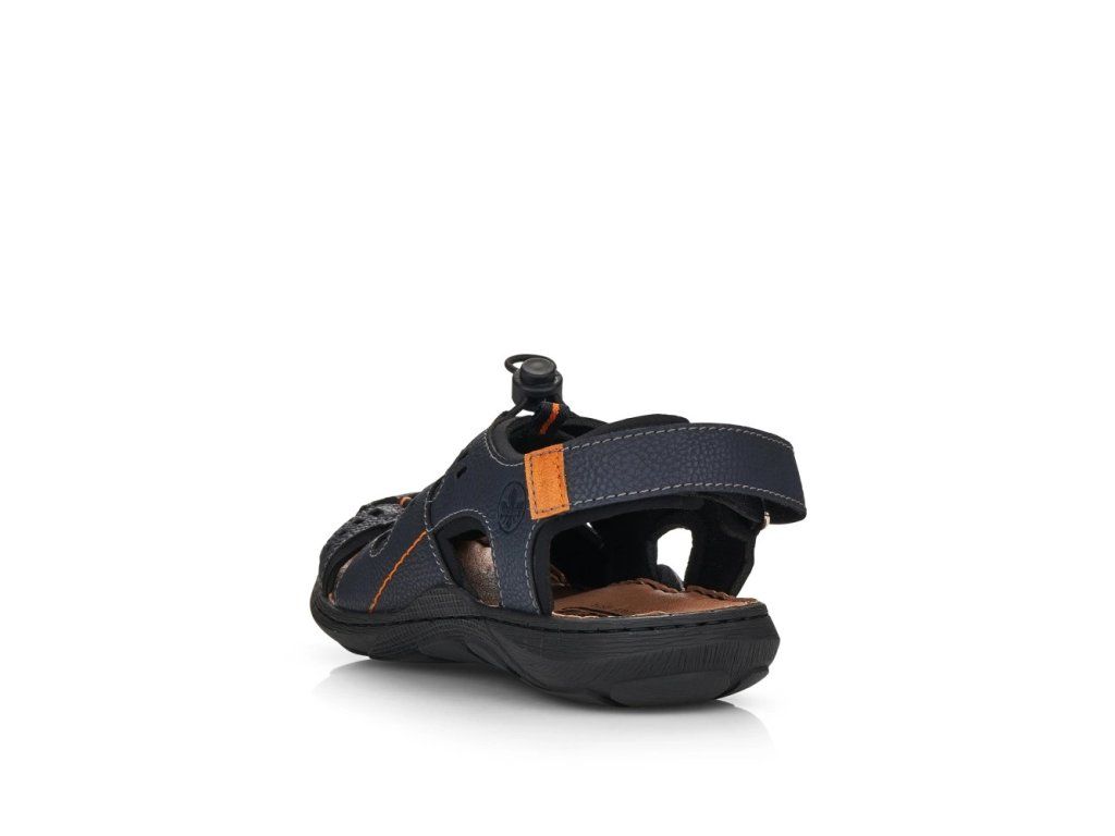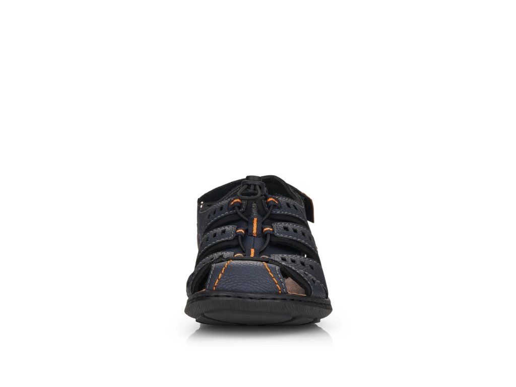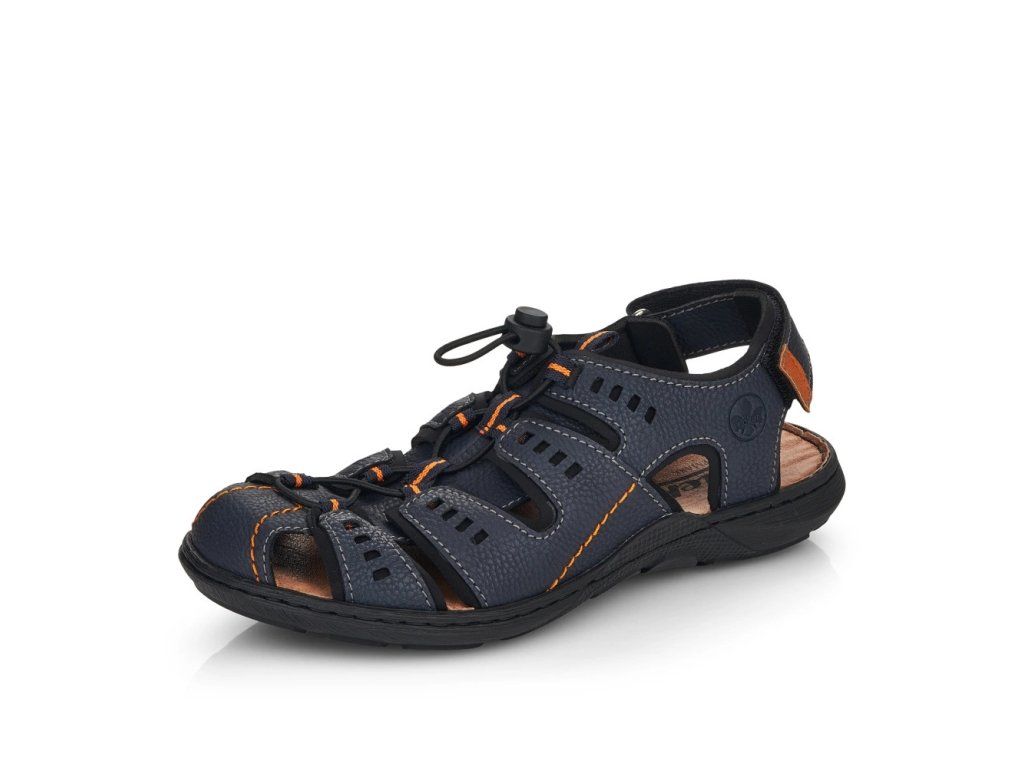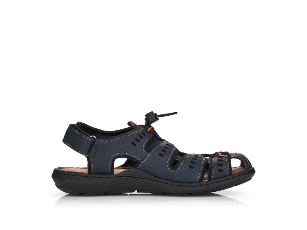 Tento model sandálů značky RIEKER ocení pánové, kteří mají radši sportovnější obuv. Svršek poskládaný z několika pásků je spojen na nártu šněrováním pružnou gumičkou, které umožní příjemné nastavení obuvi dle požadavků. Pásek kolem paty vybavený suchým zipem usnadní nazouvání a měkká kožená stélka se postará o potřebný komfort. Do města či do lesa, to už je jen na Vás kam se v této obuvi vydáte.