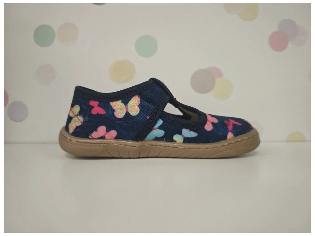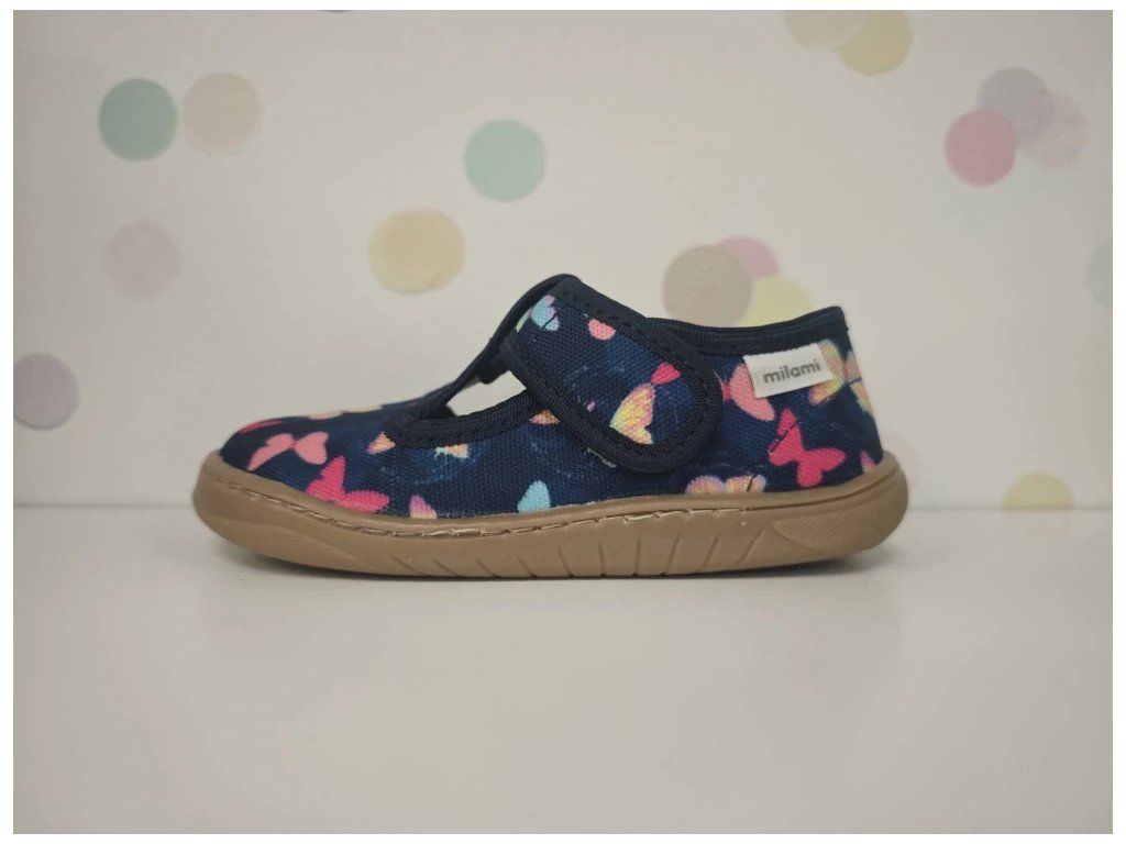 Dětské textilní barefoot přezůvky od srbské značky Milami jsou lehké, flexibilní a zapínají se pomocí suchého zipu. Boty mají zpevněný opatek a koženou, vyjímatelnou stélku bez podpory klenby. Prstová část nabízí dostatek prostoru, takže se jedná o barefoot kompromis. Podešev je dostatečně odolná i pro venkovní použití, není však vhodná na odrážedla, kola, skluzavky a jiné aktivity, které výrazně zatěžují podrážku.